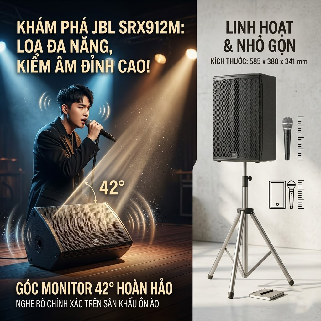 Trong các hệ thống âm thanh chuyên nghiệp, một chiếc loa kiểm âm sân khấu chất lượng đóng vai trò cực kỳ quan trọng để đảm bảo nghệ sĩ nghe rõ và kiểm soát tốt phần trình diễn của mình. Loa JBL SRX 912M là mẫu loa active 12 inch hai đường tiếng thuộc dòng SRX cao cấp của JBL, được thiết kế nhỏ gọn nhưng mang lại công suất và hiệu suất âm thanh vượt trội. Sản phẩm có thể linh hoạt sử dụng cho nhiều mục đích như loa chính (PA), loa kiểm âm sân khấu hoặc loa front fill, phù hợp cho sân khấu biểu diễn, hội trường, sự kiện và các hệ thống âm thanh chuyên nghiệp cần độ ổn định cao.