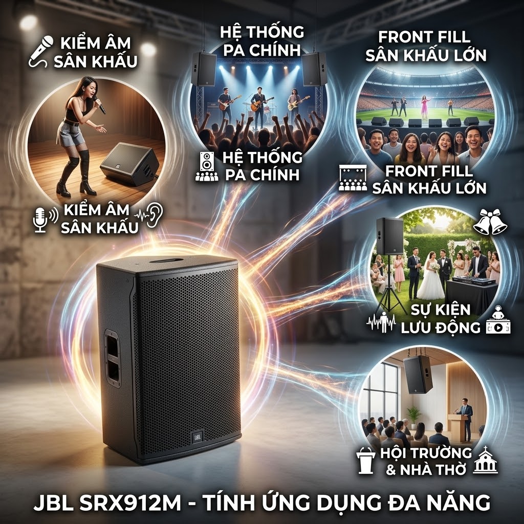 Nhờ thiết kế đa năng, công suất mạnh mẽ và khả năng kiểm soát âm thanh chính xác, JBL SRX 912M có thể đáp ứng nhiều nhu cầu sử dụng trong các hệ thống âm thanh chuyên nghiệp:
