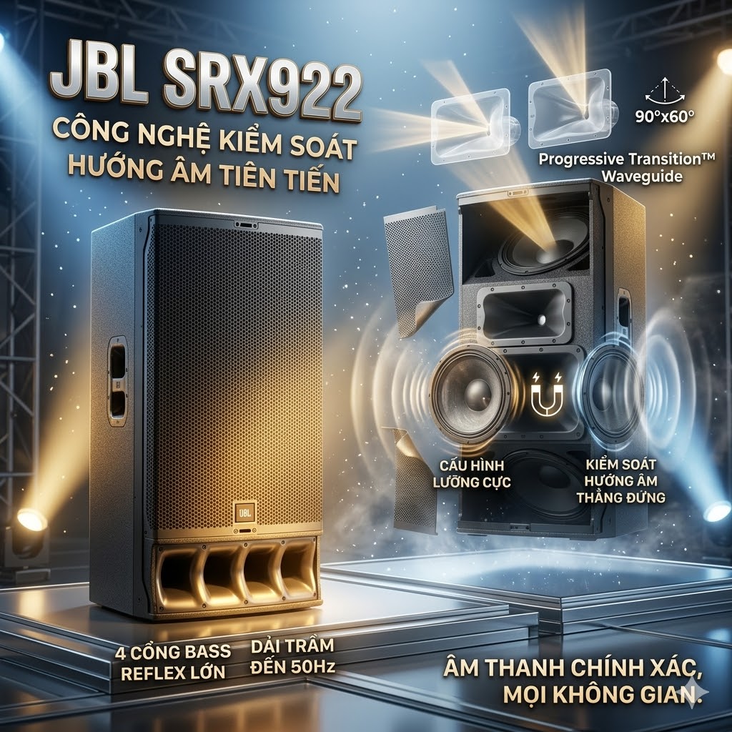 Một trong những ưu điểm nổi bật của JBL SRX922 là khả năng kiểm soát hướng âm chính xác nhờ thiết kế âm học tiên tiến. Loa sử dụng hai ống dẫn sóng Progressive Transition™ kép, giúp đảm bảo vùng phủ âm ổn định với góc phủ 90° × 60°. Thiết kế waveguide này cho phép âm thanh lan tỏa đồng đều trong không gian, hạn chế hiện tượng điểm chết hoặc vùng âm quá mạnh.