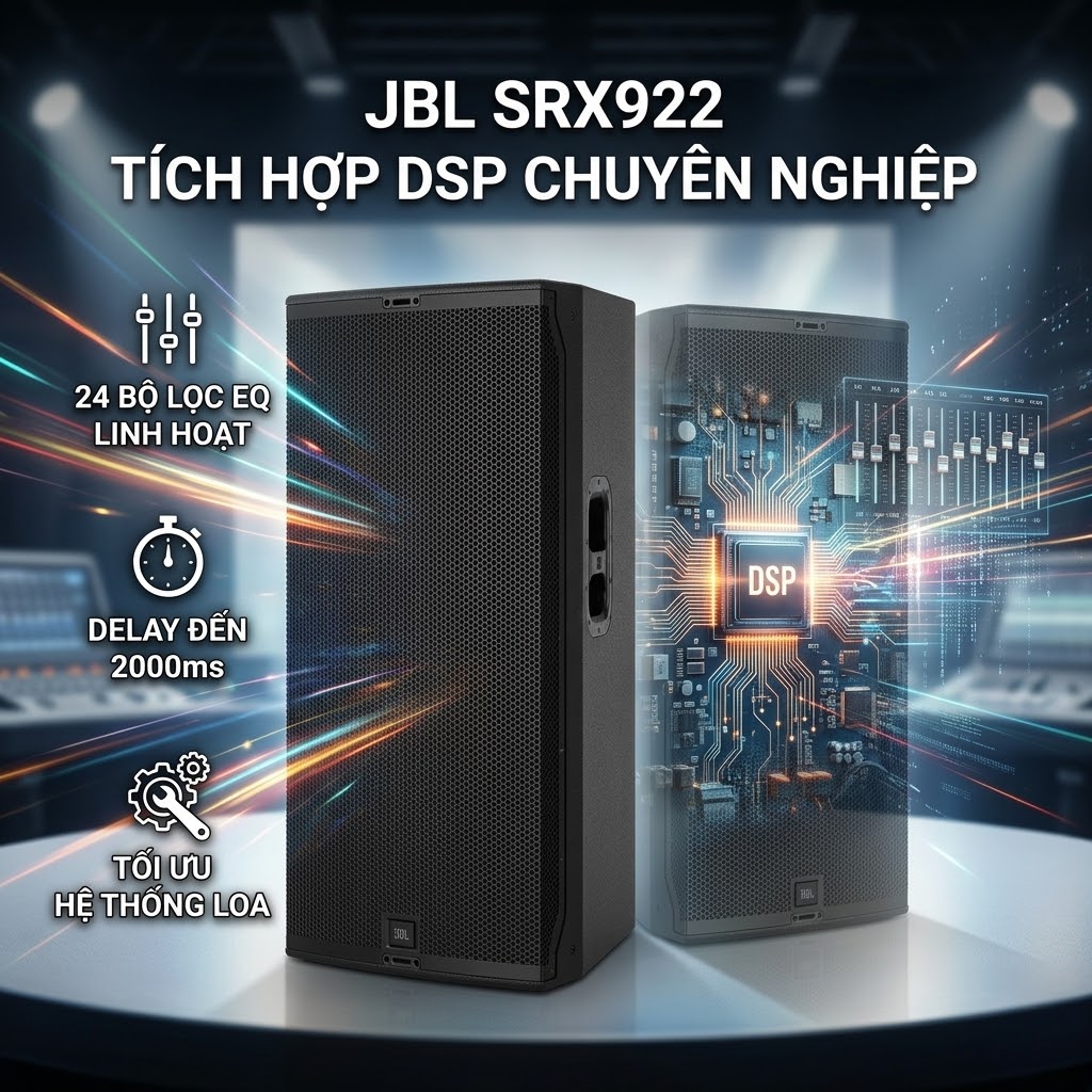 Hệ thống DSP tích hợp trên loa JBL SRX922 mang đến khả năng kiểm soát và tối ưu âm thanh chuyên nghiệp ngay trên thiết bị, giúp quá trình vận hành trở nên đơn giản hơn nhưng vẫn đạt hiệu quả cao.