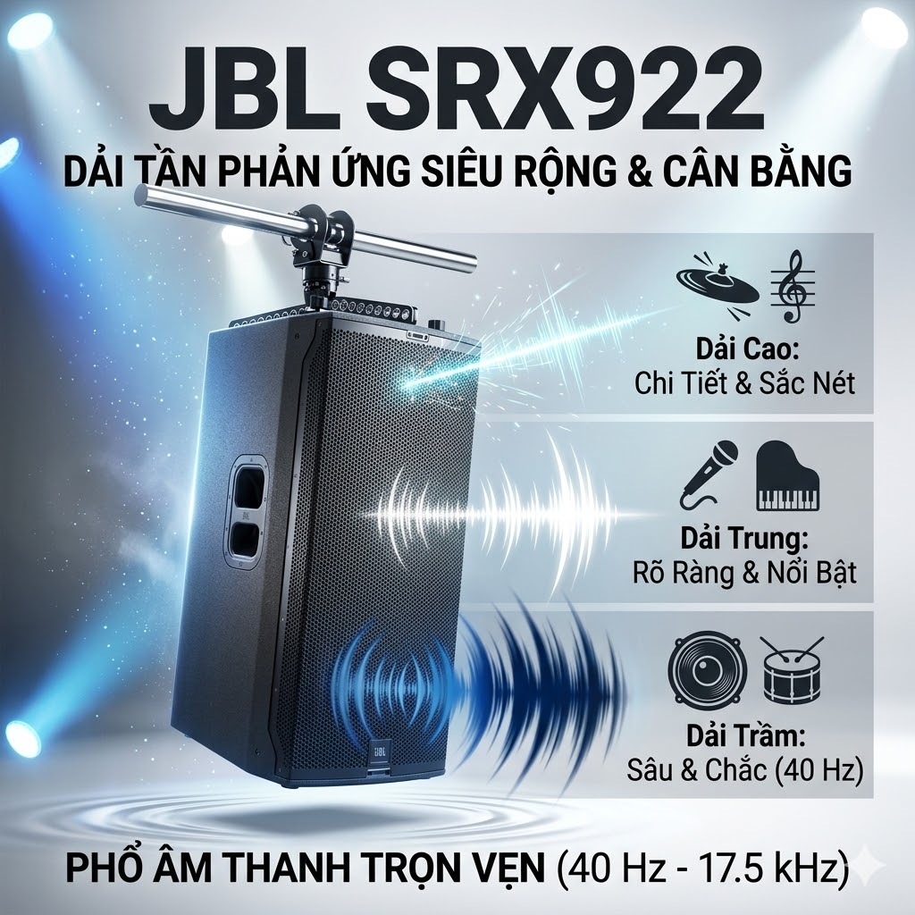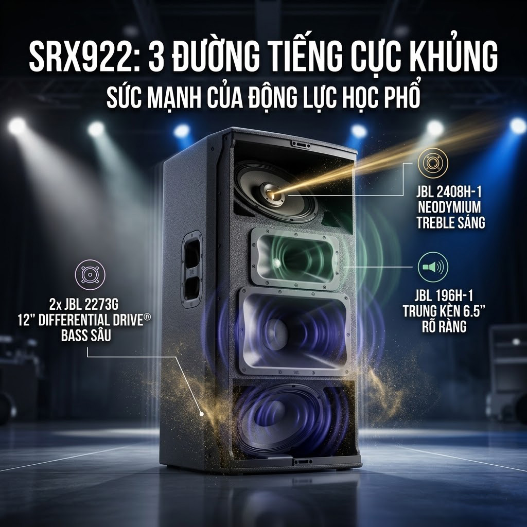 Sức mạnh của JBL SRX922 đến từ cấu trúc ba đường tiếng chuyên nghiệp, giúp tái tạo âm thanh đầy đủ từ dải trầm sâu đến dải cao chi tiết.