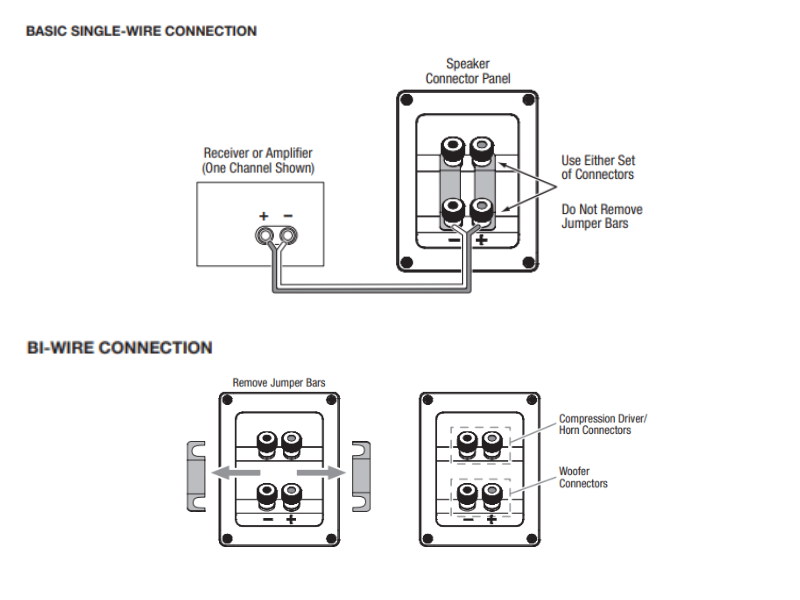 Bi-wire là phương pháp tách riêng tín hiệu cho loa bass/mid và treble, mang lại âm thanh chi tiết và hạn chế nhiễu chéo. Khi thực hiện, cần tháo bỏ jumper bar.