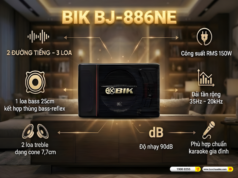 Tổng thể, BIK BJ-S886NB là mẫu loa được tinh chỉnh đúng cho dàn karaoke gia đình: dễ hát, dễ nghe, ít phải chỉnh nhiều. Âm thanh tập trung phục vụ giọng ca, bass vừa đủ, treble êm, dùng lâu không mệt. Đây là kiểu loa mà chỉ cần nghe thử vài bài là muốn hát tiếp, rất phù hợp cho những gia đình yêu ca hát và giải trí tại nhà.