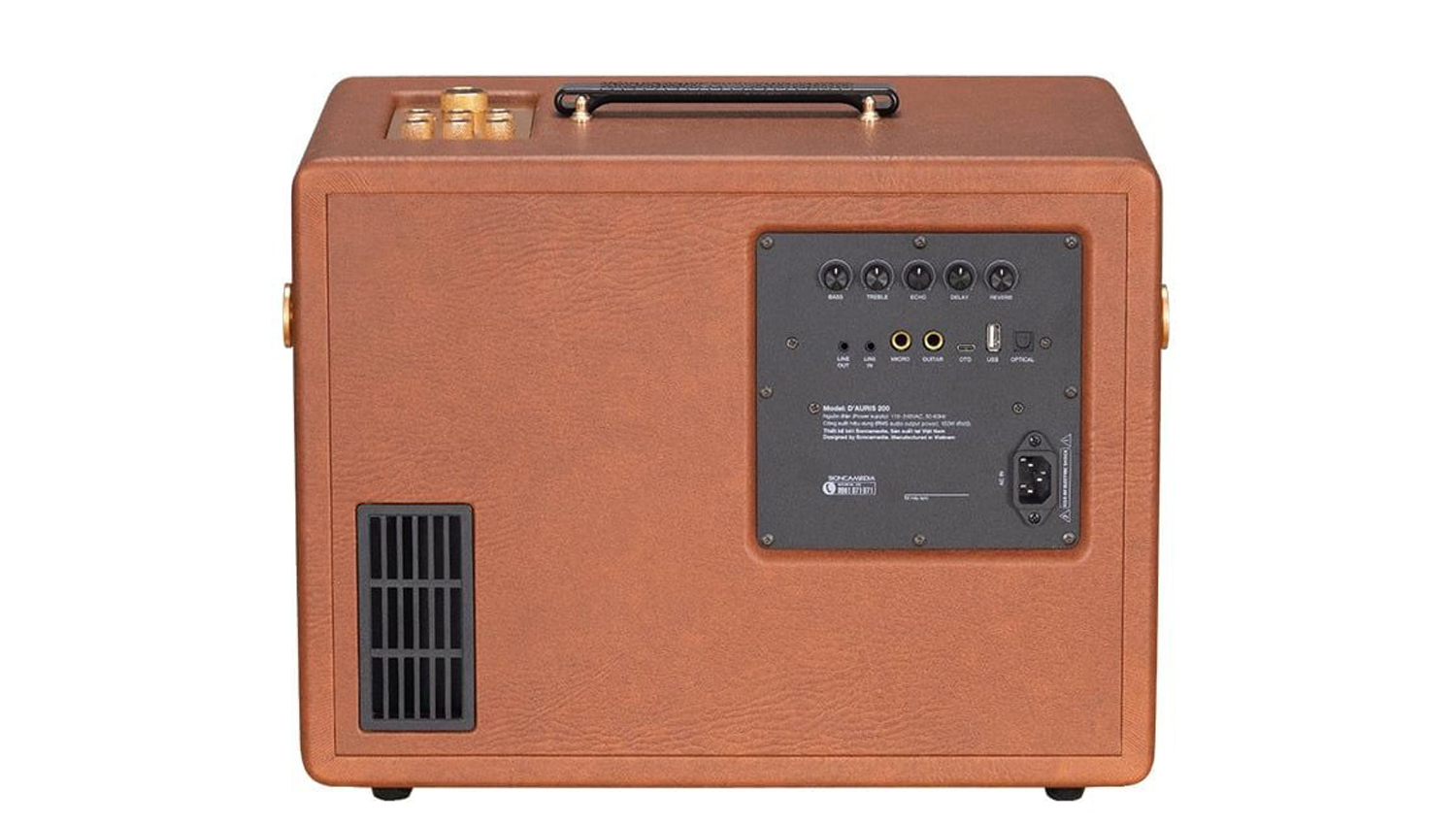 Trên thân loa Acnos D Auris 200, hệ thống nút bấm vặn cơ học được bố trí gọn gàng ở mặt trên, hoàn thiện kim loại ánh vàng nổi bật trên nền da nâu sang trọng. Các nút chỉnh EFFECT, ECHO, DELAY, REVERB cho phép người dùng thao tác trực tiếp, xoay - chỉnh nhanh chỉ trong vài giây mà không cần thiết bị hỗ trợ.