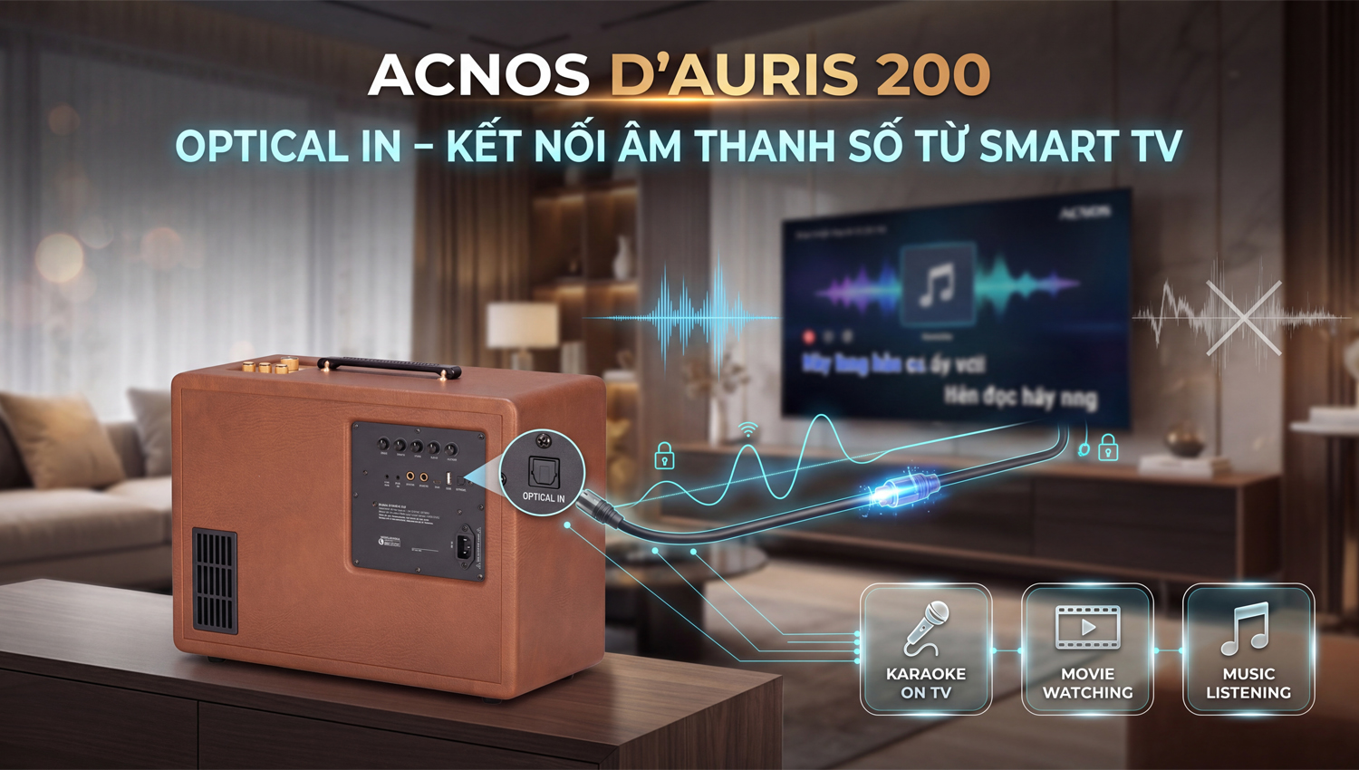 - Kết nối Smart TV hát karaoke tại nhà: Nhận âm thanh trực tiếp qua cổng Optical, giúp hát karaoke trên tivi với chất lượng âm thanh sạch, ổn định.