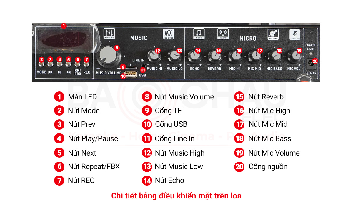 - AUX IN (3.5mm): Kết nối trực tiếp với máy tính, đầu đĩa hoặc các thiết bị phát nhạc khác.