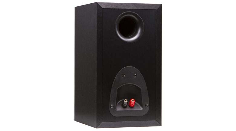 Mặt sau là nơi bố trí cổng đấu loa và lỗ thông hơi hỗ trợ âm trầm tối đa, để đảm bảo chất lượng âm thanh thì người dùng không nên đặt loa Klipsch R 15M sát tường.
