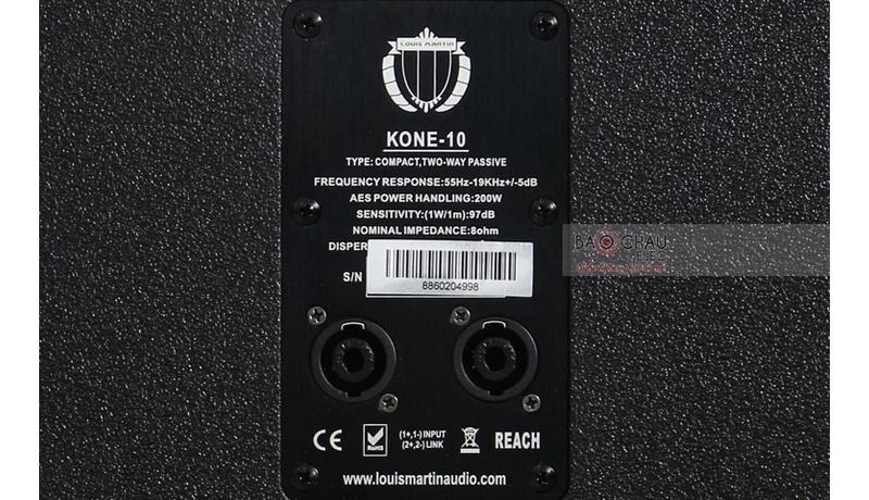 Mặt sau loa louis Martin kone10 là nơi bố trí các ngõ vào âm thanh với 2 đầu kết nối Neutrik® Speakon® NL4MP chắc chắn. Bên trên các ngõ kết nối này, nhà sản xuất có in đầy đủ các thông tin về thông số kỹ thuật của loa, tên model....Việc kết nối loa nhờ vậy mà đơn giản hơi.