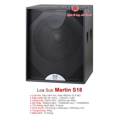 Loa siêu trầm Martin S18 - dòng siêu trầm có bass lên tới gần 50cm (5 tấc) thuộc dòng loa Martin đang được Bảo Châu Elec phân phối trên hệ thống showroom âm thanh hiện đại toàn quốc với giá thành hợp lý nhất. Xin mời quý vị và các bạn xem qua những thông tin cần thiết về sản phẩm này: