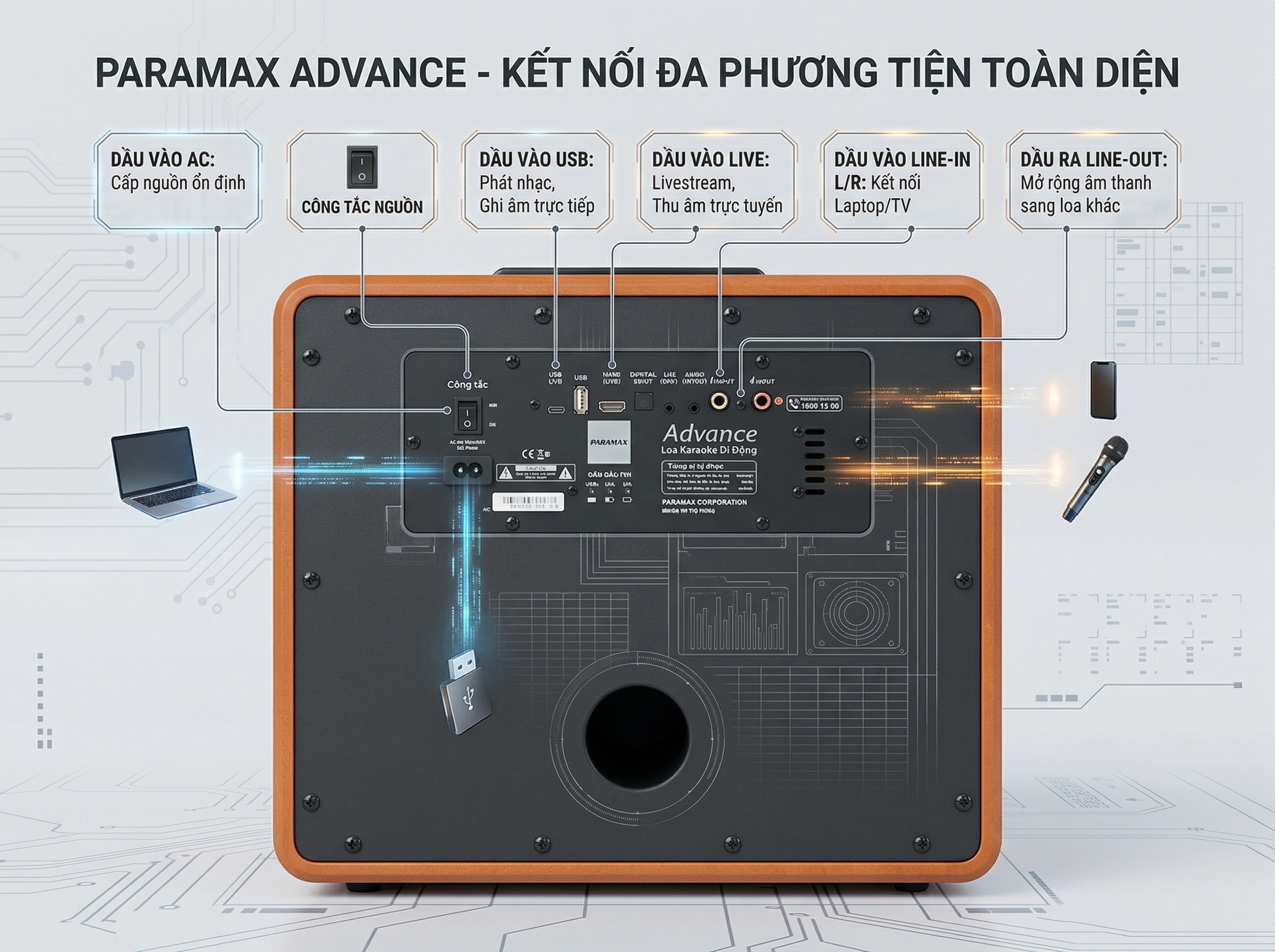 Để đáp ứng nhu cầu giải trí đa dạng của thời đại số, Paramax Advance được trang bị hệ thống cổng kết nối "tận răng", biến nó thành một hub giải trí thực thụ: