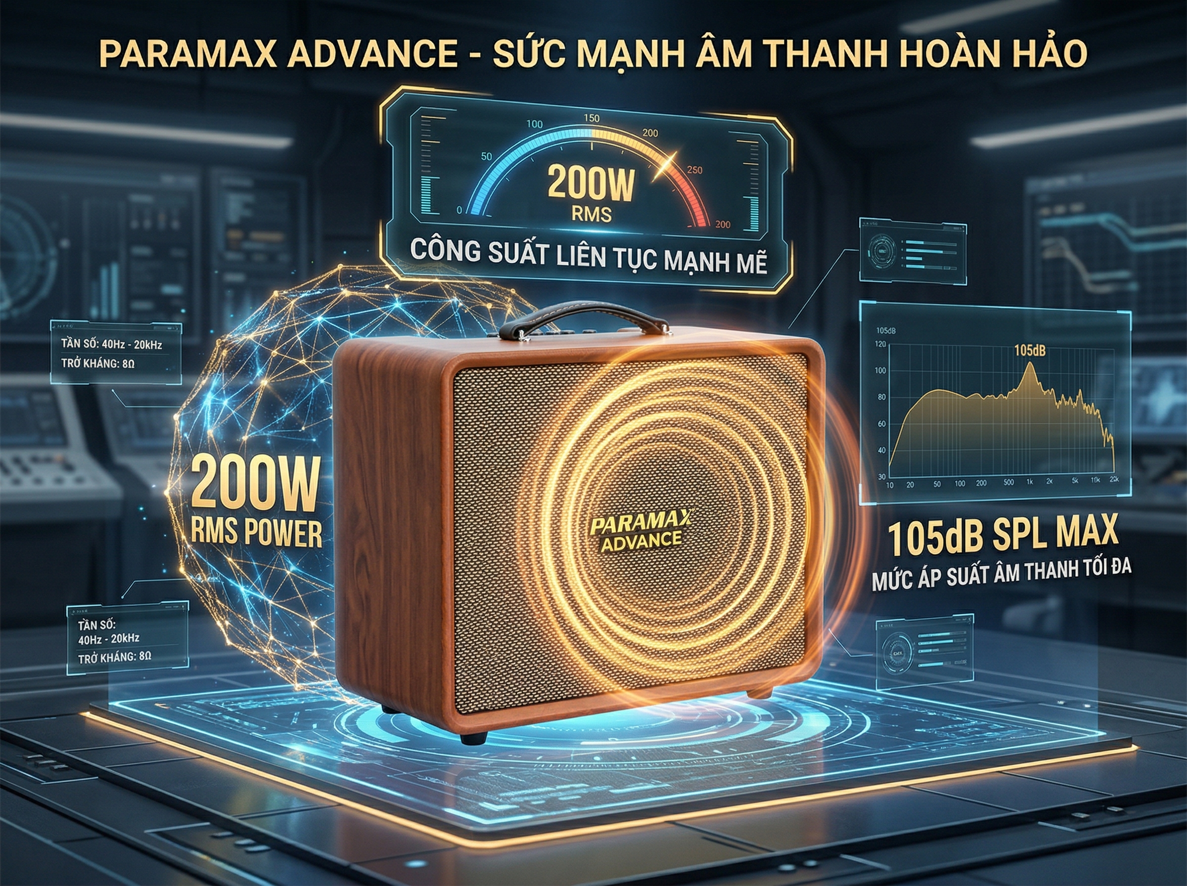 Dù có ngoại hình nhỏ gọn, nhưng Paramax Advance sở hữu mức công suất RMS lên đến 200W. Mức công suất này cho phép loa hoạt động bền bỉ trong thời gian dài với áp suất âm thanh tối đa (SPL) lên đến 105dB. Bạn có thể thoải mái sử dụng loa trong phòng khách gia đình hoặc các không gian mở ngoài trời như sân vườn, bãi biển mà âm thanh vẫn phủ đều, không bị loãng.