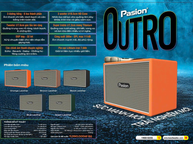 PASION Outro mang đến 5 lựa chọn màu sắc thời trang: Orange Leather, Brown Leather, Green Leather, Blue Leather, Black Leather. Mỗi màu sắc thể hiện phong cách riêng, từ trẻ trung, vintage đến mạnh mẽ và hiện đại. Nhờ đó, loa không chỉ là thiết bị nghe nhạc hay hát karaoke chất lượng cao, mà còn trở thành món đồ trang trí tinh tế, dễ kết hợp với mọi không gian như phòng khách, studio cá nhân, quán cafe hay các sự kiện ngoài trời.