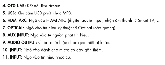 Các cổng kết nối có dây gồm HDMI (ARC) và Optical, giúp loa tương thích hoàn hảo với TV. Ngoài ra, loa còn có ngõ Guitar/Keyboard, phù hợp cho biểu diễn âm nhạc sống; cổng OTG Live cho phép livestream chất lượng cao mà không cần thiết bị thu trung gian. Bên cạnh đó là các cổng quen thuộc như USB, AUX và MIC 6.35mm, mang đến khả năng kết nối nhanh, ổn định và mượt mà với mọi thiết bị âm thanh.