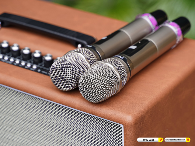 Đi kèm loa là bộ 2 micro không dây chất lượng cao, cho khả năng bắt âm chuẩn xác và độ nhạy tốt, giúp tái hiện giọng hát rõ ràng và sáng hơn. Micro sử dụng công nghệ chống nhiễu, hạn chế tối đa tạp âm và tiếng ồn, đảm bảo phần trình diễn mượt mà, không bị chói hay méo tiếng. H