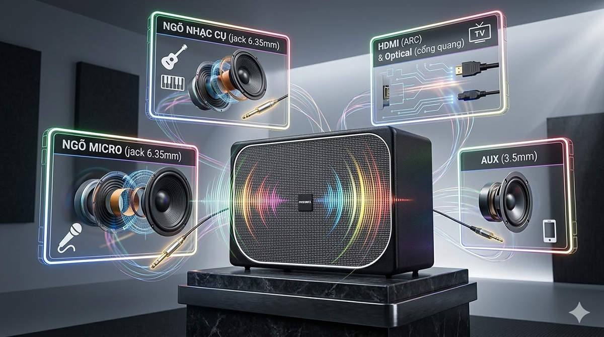 - Ngõ micro (jack 6.35mm): Kết nối micro có dây cho tín hiệu ổn định, độ trễ thấp, phù hợp hát karaoke hoặc sử dụng chuyên nghiệp.