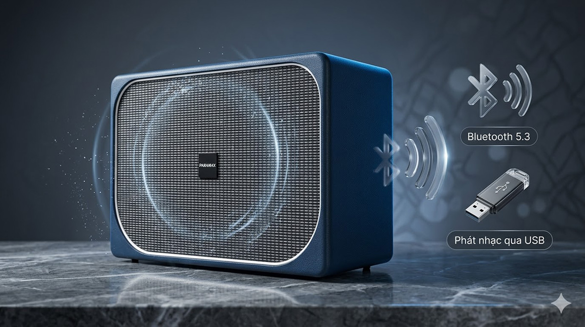 Loa Paramax Sono được trang bị Bluetooth 5.3, giúp kết nối nhanh, ổn định và tiết kiệm năng lượng hơn so với các chuẩn cũ. Người dùng có thể phát nhạc trực tiếp từ điện thoại, tablet mà không cần dây kết nối, rất tiện lợi trong các buổi tiệc hoặc sử dụng hàng ngày. Ngoài ra, loa còn hỗ trợ phát nhạc qua USB, cho phép nghe nhạc trực tiếp mà không cần thiết bị trung gian. Điều này giúp tối giản thao tác và tăng trải nghiệm sử dụng.