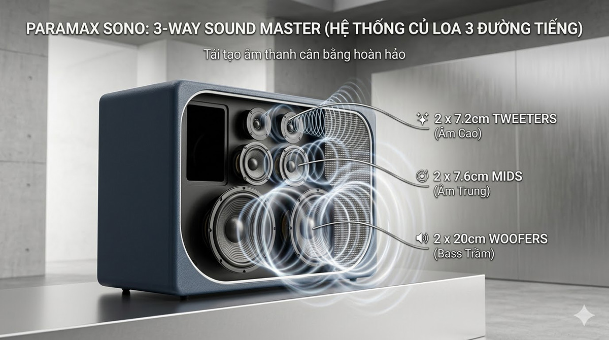 Loa Paramax Sono sở hữu cấu hình 3 đường tiếng với 6 củ loa là nền tảng giúp hệ thống tái tạo âm thanh đầy đủ và tách bạch: