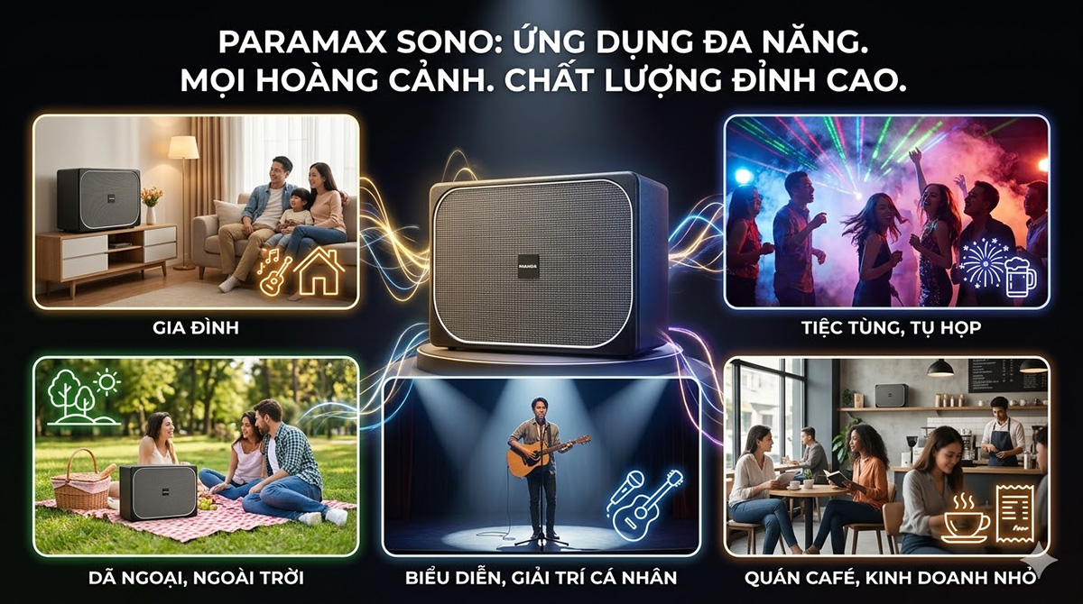 Với thiết kế gọn gàng, công suất mạnh mẽ cùng khả năng kết nối đa dạng, loa Paramax Sono không chỉ là một chiếc loa karaoke đơn thuần mà còn là giải pháp âm thanh đa năng cho nhiều mục đích sử dụng khác nhau: