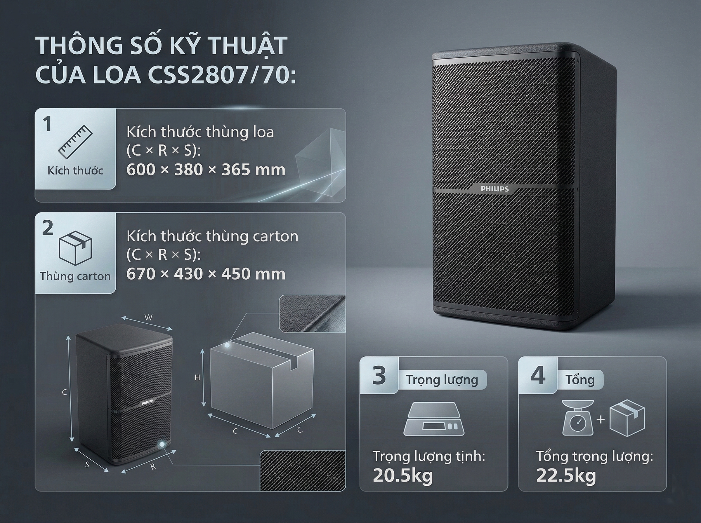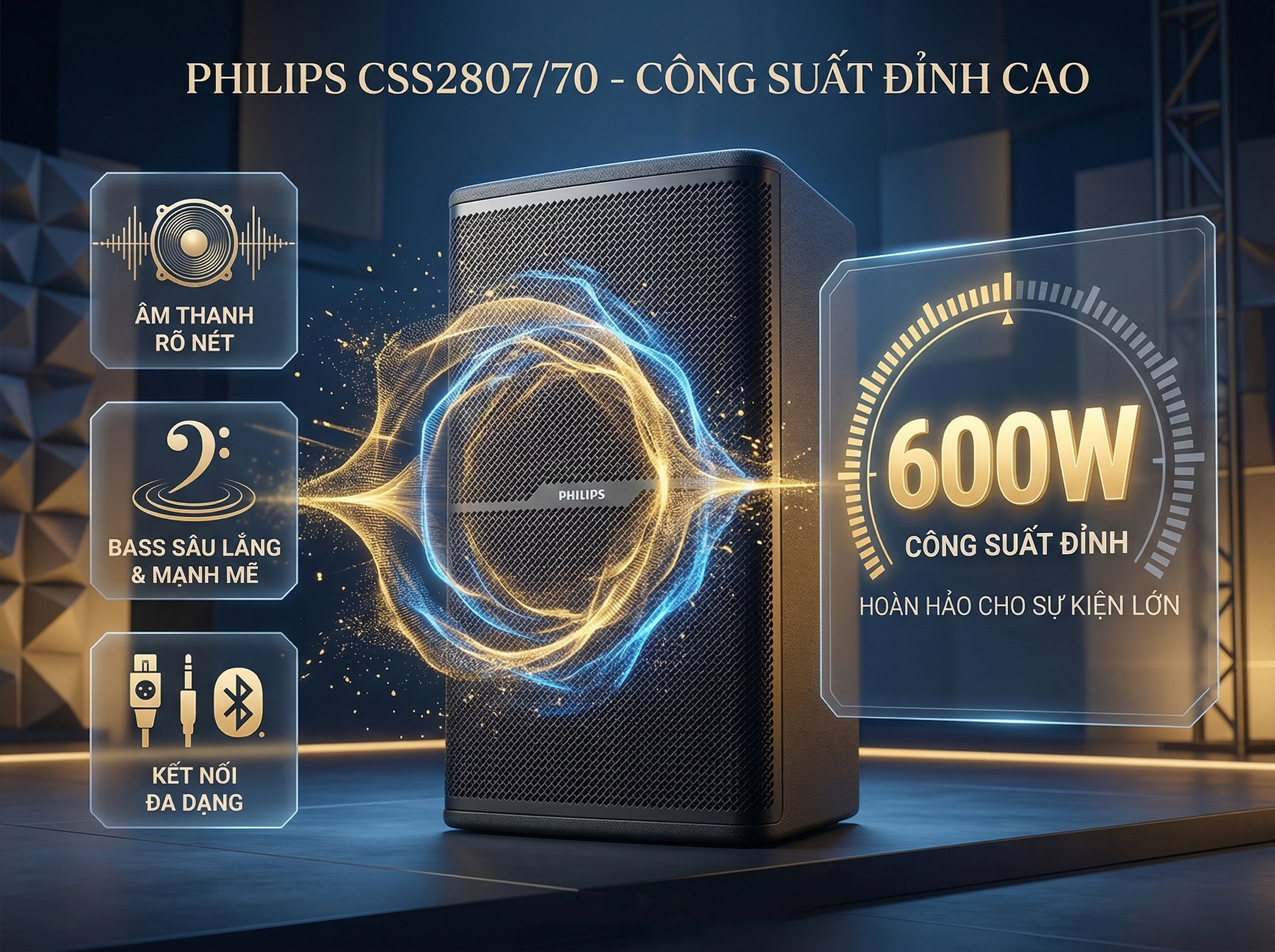 Với thiết kế loa toàn dải bass 30cm cùng công suất 600W mạnh mẽ, Loa Philips CSS2807/70 mang đến khả năng tái tạo âm thanh đầy đủ dải tần, âm bass chắc gọn, treble sáng rõ, phù hợp cho nhiều không gian giải trí khác nhau từ gia đình đến kinh doanh. Không chỉ nổi bật ở hiệu suất âm thanh, sản phẩm còn được tối ưu về cấu trúc củ loa, độ bền và khả năng phủ âm, giúp hệ thống hoạt động ổn định và hiệu quả lâu dài.