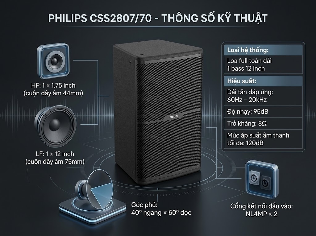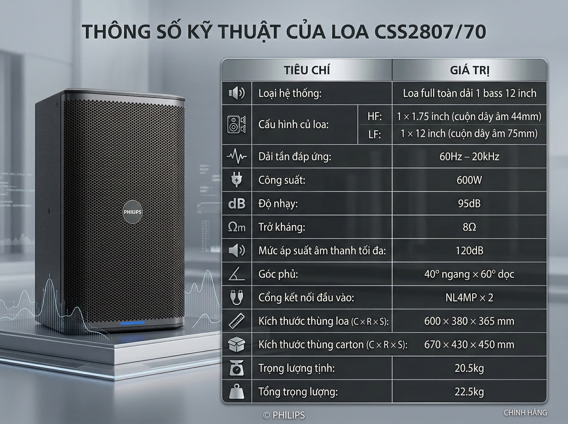 Loa Philips CSS2807/70 là sự kết hợp giữa công suất mạnh mẽ, cấu trúc củ loa chất lượng và khả năng phủ âm hợp lý mang lại hiệu suất hoạt động ổn định, phù hợp cho nhiều hệ thống âm thanh khác nhau. - Trang bị bass 30cm (cuộn dây 75mm) cho âm trầm chắc, có lực và 1 củ treble 4.4cm (cuộn dây 44mm) cho dải cao sáng rõ, chi tiết. - Công suất 600W mạnh mẽ tái tạo các dải tần một cách hoàn hảo. - Dải tần 60Hz – 20kHz giúp tái tạo âm thanh khá đầy đủ, từ âm trầm sâu đến âm cao trong trẻo. - Độ nhạy 95dB cho khả năng phát ra âm lượng lớn ngay cả khi ghép với ampli công suất vừa phải. - Mức áp suất âm thanh tối đa 120dB, đáp ứng tốt các không gian phòng có diện tích trung bình đến lớn. - Góc phủ âm 40° x 60° giúp âm thanh tập trung và phân bổ đều trong khu vực nghe. - Trang bị 2 cổng kết nối NL4MP, chuẩn kết nối chuyên nghiệp giúp truyền tín hiệu ổn định và dễ dàng ghép nối với ampli hoặc hệ thống âm thanh sân khấu. - Phù hợp sử dụng trong dàn karaoke gia đình cao cấp, phòng hát kinh doanh hoặc hệ thống âm thanh sân khấu nhỏ.