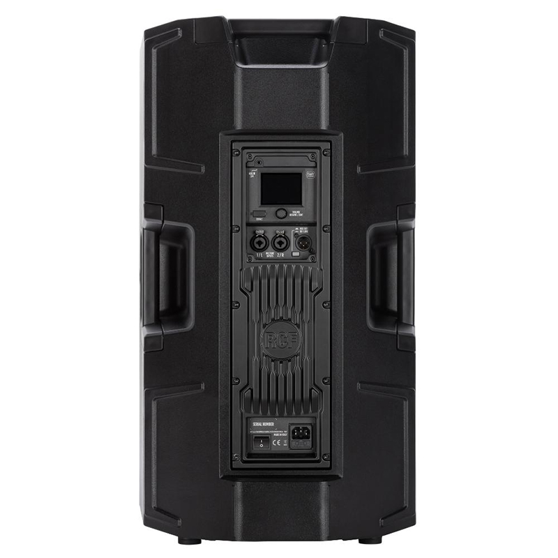 Mặt trước của loa cũng có một lỗ thoát âm tròn, nơi driver nén được đặt, với logo RCF trang trí ở giữa. Mặt sau của loa có nhiều cổng kết nối đa dạng, bao gồm một đầu vào XLR và một đầu ra XLR dùng để kết nối với các thiết bị âm thanh khác như mixer, ampli, hoặc loa subwoofer.