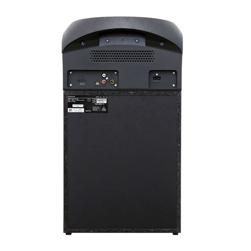 Mặt sau là hệ thống cổng kết nối như cổng USB, cổng ăng ten, cổng RCA, cổng micro, cổng nguồn giúp quá trình kết nối thuận tiện. Phía dưới loa tích hợp lỗ gắn giúp cho việc đặt loa trên giá đỡ 3 chân giúp loa có vị trí cao hơn, âm thanh truyền đi tốt hơn và đèn LED phân tán rộng hơn.
