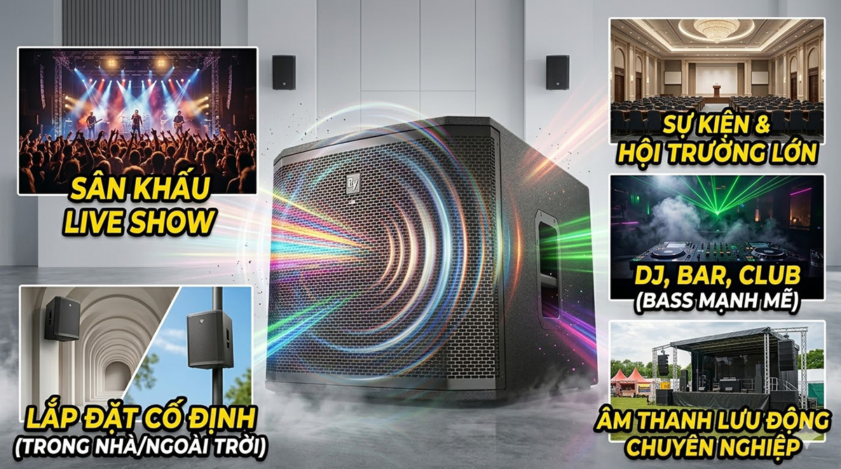 - Hệ thống âm thanh sân khấu biểu diễn live show: Cung cấp dải trầm sâu và uy lực, giúp tăng độ hoành tráng cho các chương trình biểu diễn trực tiếp, liveshow ca nhạc hoặc sân khấu ngoài trời.