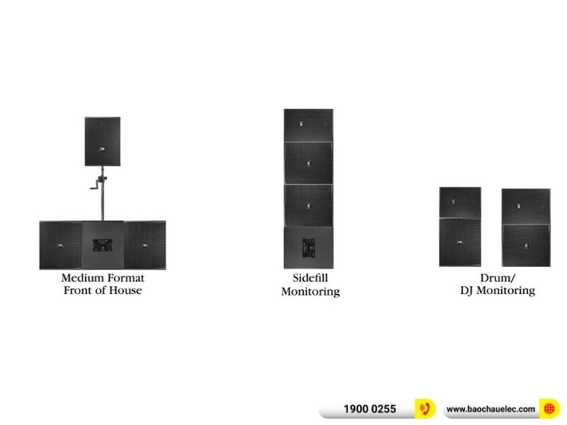 Cấu hình Front of House quy mô trung bình, trong đó loa sub JBL VTX F18S được sử dụng làm nền tảng tái tạo dải trầm, kết hợp với loa toàn dải VTX F12 hoặc VTX F15 đặt phía trên thông qua ty loa. Cấu hình này phù hợp cho sân khấu biểu diễn, sự kiện, hội trường nhỏ đến trung bình, đảm bảo âm trầm mạnh mẽ, tập trung và cân bằng tổng thể hệ thống.