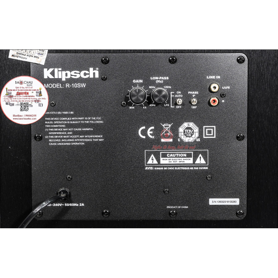Sản phẩm loa sub Klipsch R10SW đang được Bảo Châu Elec phân phối đảm bảo hàng chính hãng với chương trình bảo hành cực tốt. Liên hệ ngay 1900 0255 để được kỹ thuật viên tư vấn và giải đáp cụ thể.