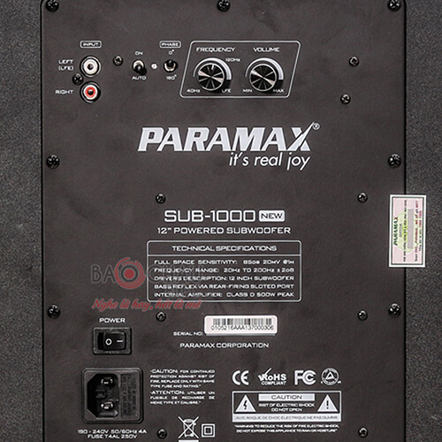 Loa sub Paramax Sub-1000 là mẫu loa siêu trầm chủ động, được thiết kế với loa woofer có đường kính 3 tấc (300mm) kết hợp với ampli gắn sẵn bên trong, có công suất đỉnh lên đến 500W.