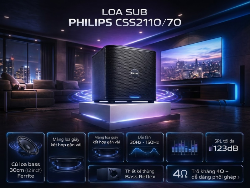 Sở hữu thiết kế chắc chắn, củ loa 12 inch mạnh mẽ, dải tần sâu tới 30Hz cùng SPL tối đa 123dB, loa sub Philips CSS2110/70 là lựa chọn đáng cân nhắc cho những ai muốn nâng cấp dải trầm cho hệ thống karaoke hoặc âm thanh giải trí.Không chỉ mang lại bass sâu, chắc và uy lực, mẫu loa sub này còn có khả năng phối ghép linh hoạt với nhiều thiết bị âm thanh khác nhau, giúp nâng tầm trải nghiệm nghe nhạc và hát karaoke một cách rõ rệt.