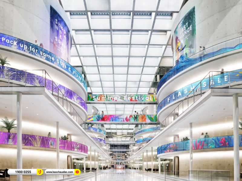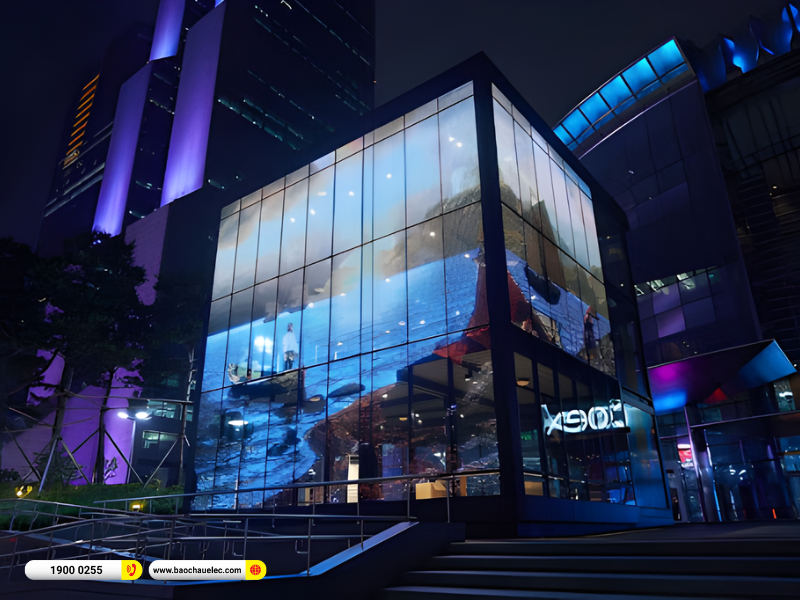 Nhờ đó, màn hình có thể dùng làm vách ngăn trong suốt, trang trí sảnh trung tâm thương mại, showroom, hoặc tạo nên những bức tranh ánh sáng ấn tượng trong không gian kiến trúc mở, giúp công trình trở nên hiện đại và tinh tế hơn.