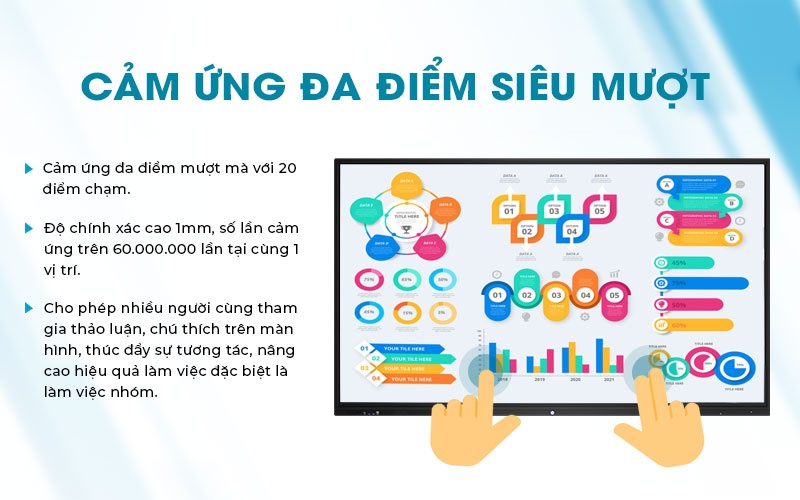 - 20 điểm chạm đồng thời: Nhiều người có thể cùng viết, vẽ, kéo thả, chỉnh sửa nội dung mà không bị xung đột thao tác.