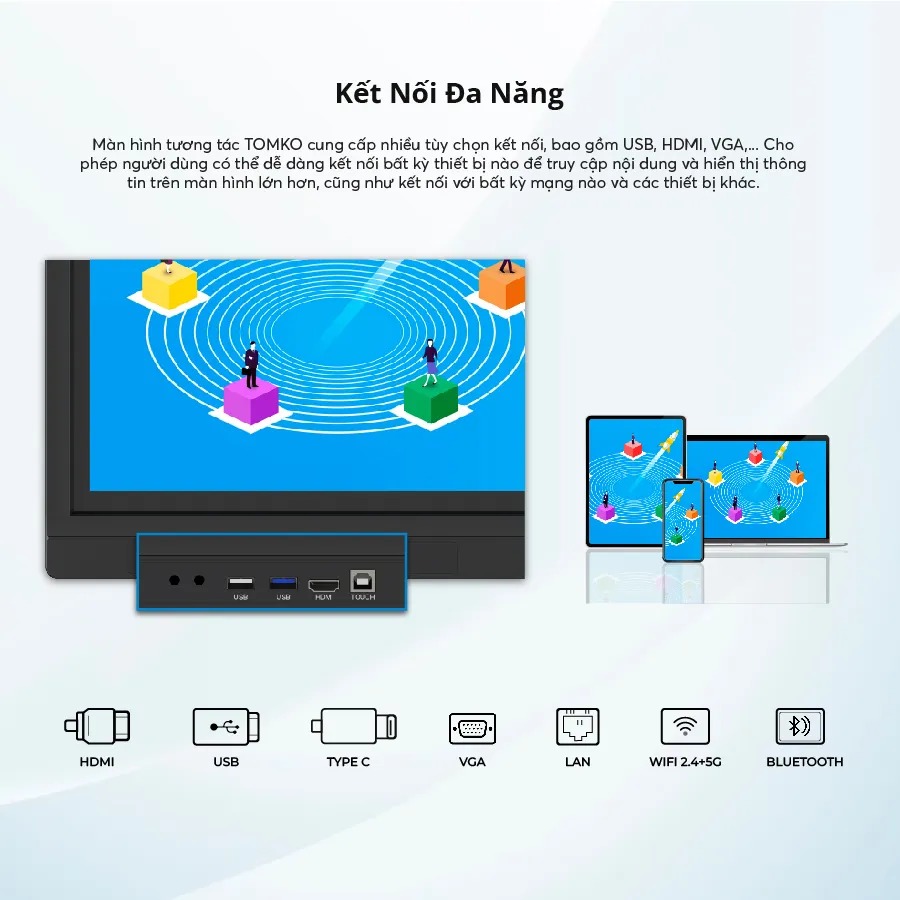 Một trong những điểm mạnh nổi bật của màn hình tương tác 86 inch TOMKO H6-860 là khả năng kết nối thiết bị cực kỳ linh hoạt. Màn hình hỗ trợ kết nối với máy tính, laptop, điện thoại thông minh thông qua WiFi không dây, giúp loại bỏ sự phụ thuộc vào dây cáp rườm rà.