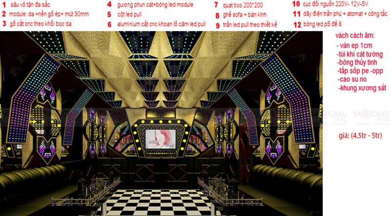 Nội thất một phòng hát chuyên nghiệp phải đầy đủ các yếu tố về đồ nội thất (bàn, ghế, bục hát), kệ thống chiếu sáng (đèn led, đèn nháy, cảm biến chiếu sáng,..), kệ thống âm thanh (loa, mic, tivi,..), kệ thống cách âm (vách cách âm, trần cách âm), trang trí phòng hát karaoke (cửa, sàn, rèm, trần,..).