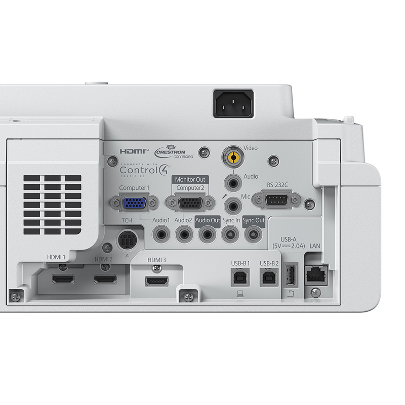 - Cổng kết nối: HDMI x3, VGA x,3 Composite, RJ45, USB-A x2, USB-B, RS-232C, 3.5mm jack, Miracast