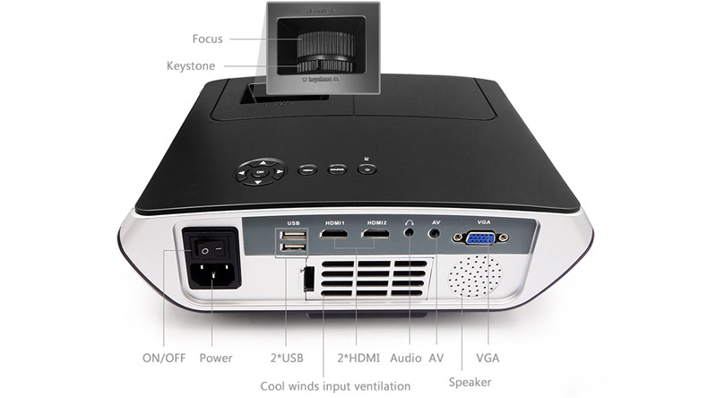 Tuy là dòng máy chiếu mini giá rẻ nhưng Tyco T2500 vẫn được trang bị đầy đủ các cổng kết nối, bao gồm 2 cổng USB, 2 cổng HDMI, 1 cổng AV, 1 cổng Audio, 1 cổng VGA nên có thể kết nối và truyền dẫn dữ liệu để trình chiếu từ nhiều thiết bị khác nhau như TV Box, camera, máy tính, điện thoại, đầu DVD, máy tính bảng, đặc biệt trình chiếu trực tiếp từ USB, ổ cứng di động.