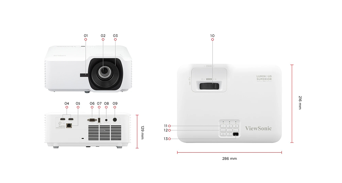 Với kích thước 286 x 216 x 129 mm, máy chiếu ViewSonic LS630HD nhỏ gọn hơn 32% so với thế hệ trước, dễ dàng đặt trên bàn, kệ hoặc lắp trần mà không chiếm nhiều diện tích. Thiết kế gọn nhẹ này cũng giúp việc di chuyển, lắp đặt và bảo trì trở nên đơn giản, đặc biệt hữu ích cho người dùng cần mang máy đến nhiều địa điểm khác nhau.