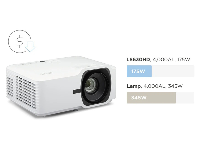 Máy chiếu ViewSonic LS630HD không chỉ mạnh mẽ mà còn là giải pháp trình chiếu tiết kiệm năng lượng hàng đầu. Nhờ sử dụng nguồn sáng laser thay cho bóng đèn truyền thống, máy giúp giảm đến 49% lượng điện tiêu thụ, góp phần giảm chi phí vận hành dài hạn cho doanh nghiệp và cá nhân.