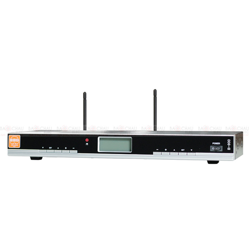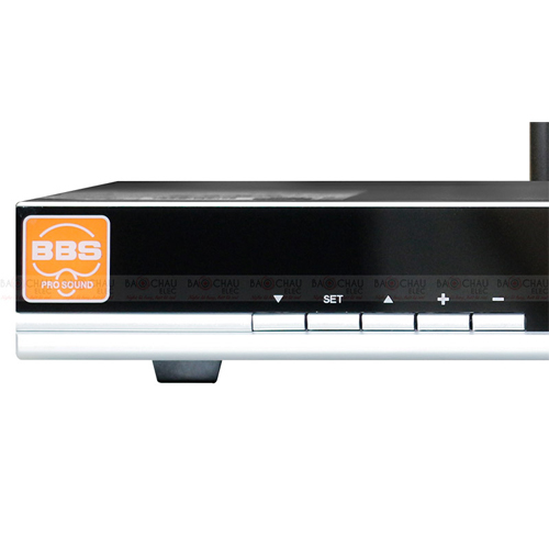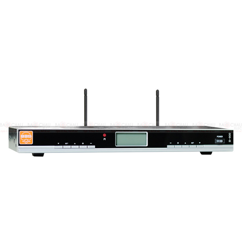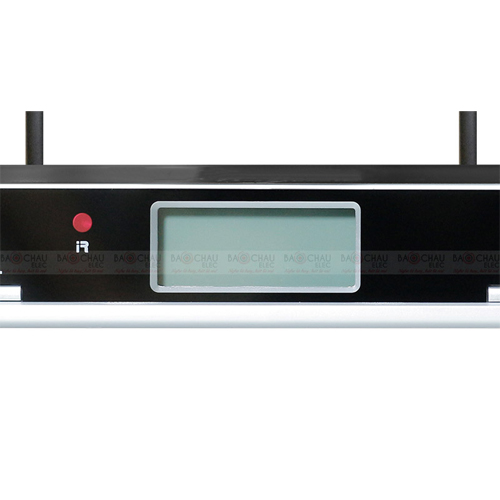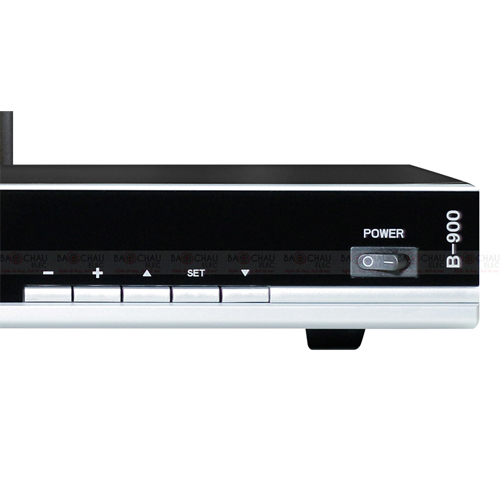 Mặt trước của đầu thu Mic không dây thiết kế khá bắt mắt, các chi tiết sắp đặt khá hợp lý, bên trái là công tắc nguồn, bên phải là tên model và logo BBS của hãng. Ở giữa tay cầm micro karaoke BBS B900 được bố trí màn hình LCD hiển thị tần số thu phát sóng, hai bên được sắp xếp các nút điều chỉnh tần số của micro.