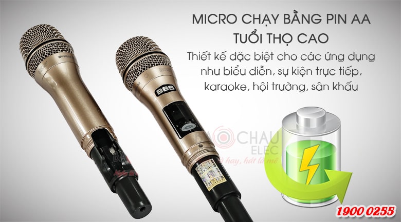 Micro chạy bằng pin AA, tuổi thọ pin cao hoạt động liên tục nhiều giờ liền. Micro được thiết kế đặc biệt cho các ứng dụng như biểu diễn, sự kiện trực tiếp , Karaoke chuyên nghiệp, hội trường, sân khấu...
