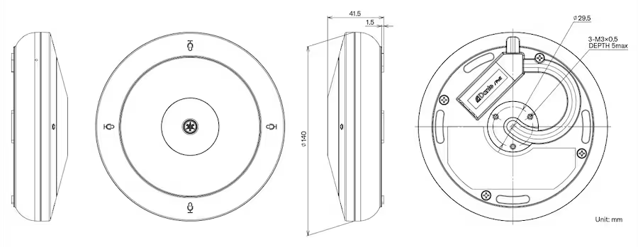 Micro có kích thước chỉ 140 × 140 × 41.5mm và trọng lượng nhẹ khoảng 310g, giúp người dùng dễ dàng lắp đặt ở nhiều vị trí khác nhau mà không chiếm nhiều diện tích. Thiết bị có thể được đặt trực tiếp trên mặt bàn hoặc gắn cố định bằng bộ phụ kiện đi kèm (adapter lắp bàn, vít và đệm cao su). Bề mặt micro được thiết kế phẳng, trang nhã, với đèn LED vòng hiển thị trạng thái hoạt động như tắt tiếng (Mute/Unmute), kết nối mạng và tình trạng hệ thống.