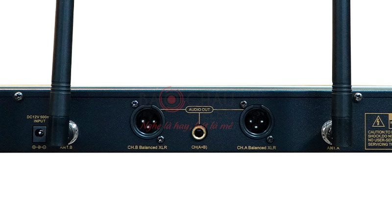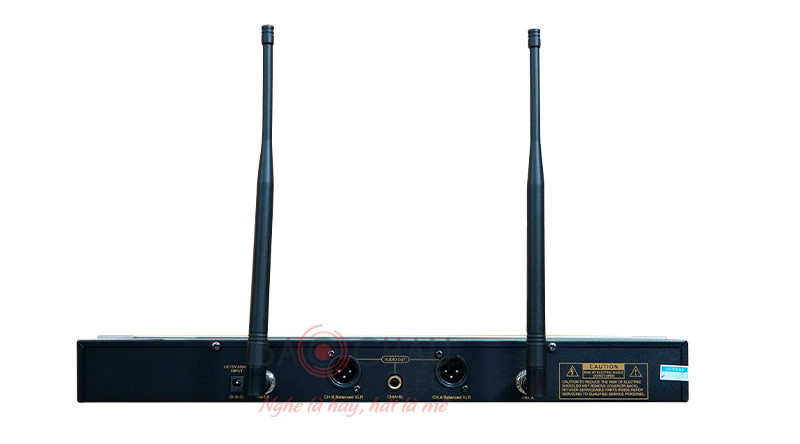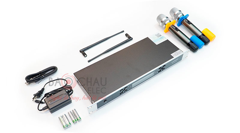 Phần đầu thu của micro được thiết kế dạng hộp chữ nhật mỏng, trọng lượng nhẹ với cấu tạo chất liệu phần vỏ cứng cáp, chắc chắn. Ngoài cùng bên phải là logo thương hiệu nổi bật, ở giữa là hệ thống điều khiển, núm vặn, màn hình LCD hiển thị thông tin cho từng micro. Mặt sau của đầu thu là các cổng kết nối, thiết kế 2 ăng tên giúp micro karaoke bắt sóng xa hơn.