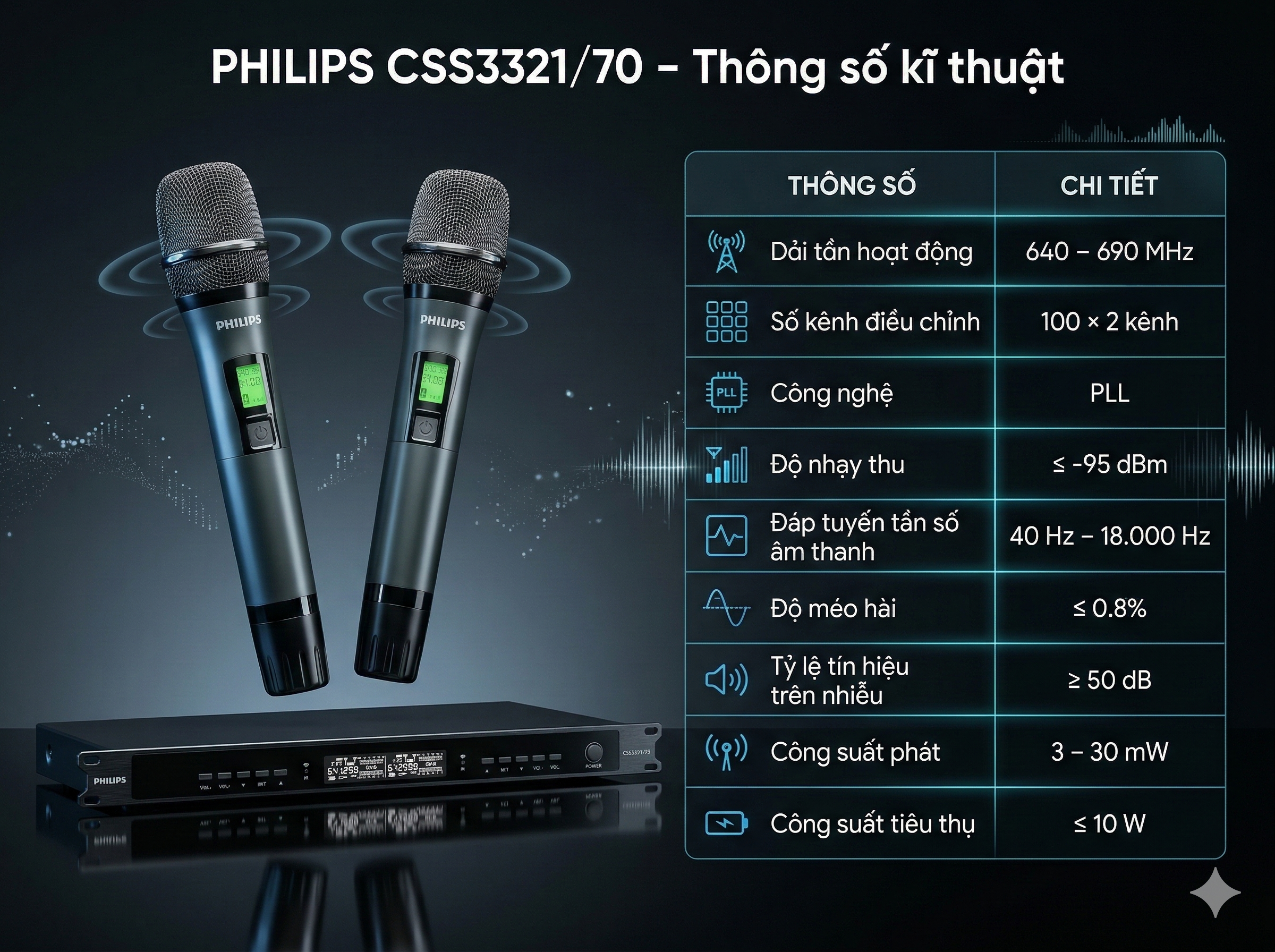 Micro không dây Philips CSS3321/70 được thiết kế để tái tạo âm thanh rõ ràng và trung thực nhờ các thông số kỹ thuật tối ưu cho giọng nói và giọng hát.