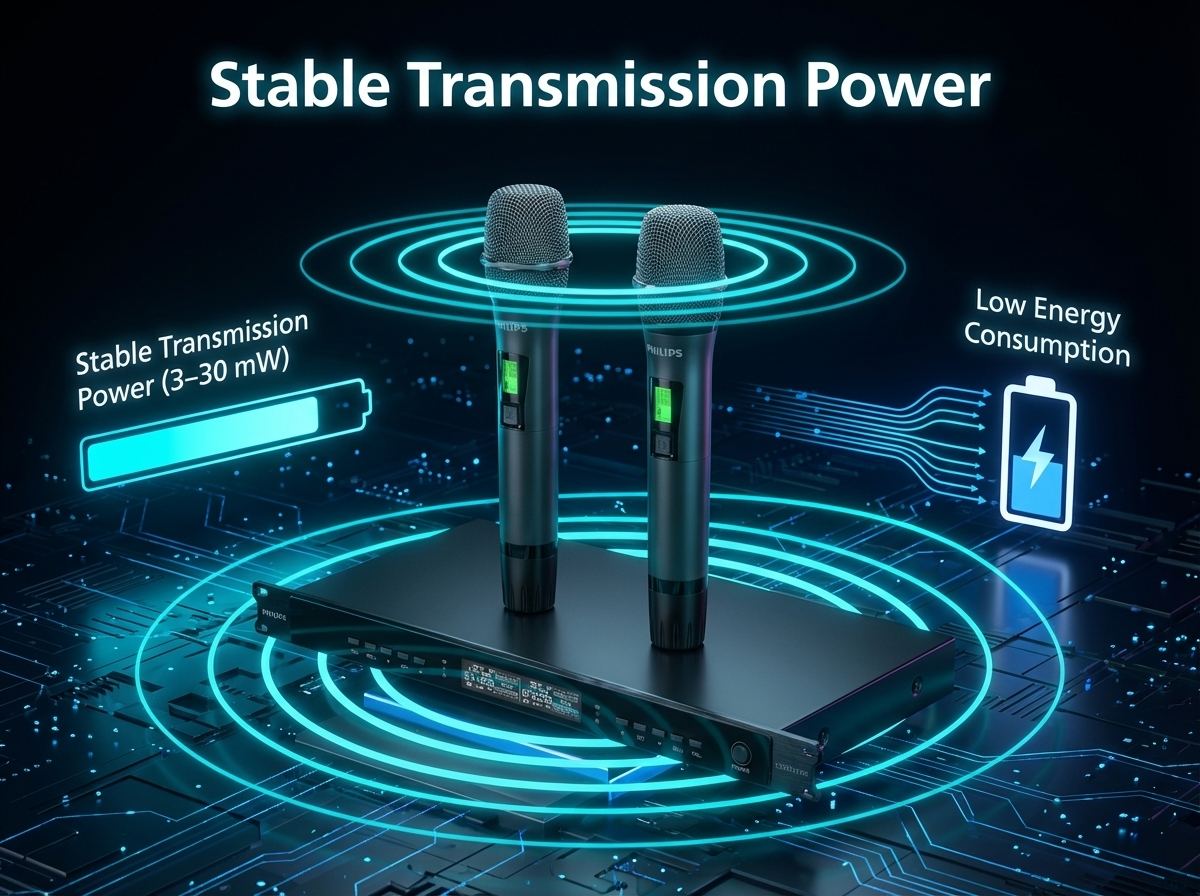 Micro cầm tay của Philips CSS3321/70 có công suất phát từ 3 - 30 mW, giúp đảm bảo khả năng truyền tín hiệu ổn định trong phạm vi sử dụng thông thường của hệ thống micro không dây.