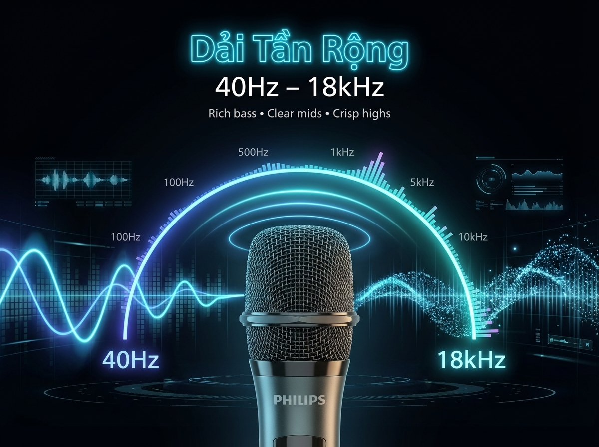 Hệ thống micro có dải tần đáp ứng 40Hz - 18kHz, cho phép tái tạo đầy đủ các dải âm từ trầm đến cao, giúp giọng nói rõ ràng và giọng hát tự nhiên hơn. Đây là dải tần phù hợp cho nhiều mục đích sử dụng như hội nghị, MC, karaoke hoặc biểu diễn.