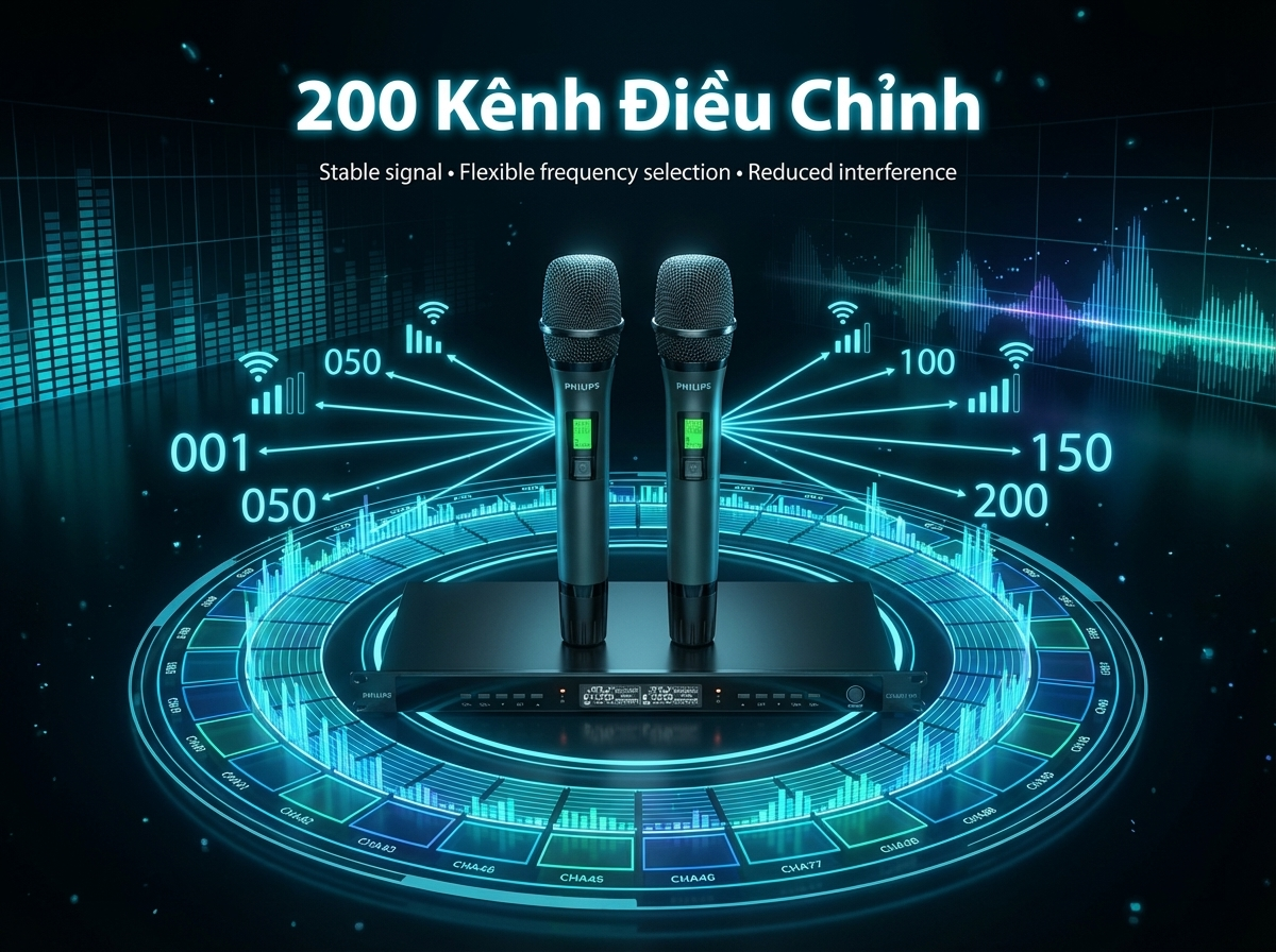 Một trong những ưu điểm quan trọng của Philips CSS3321/70 là khả năng cung cấp 200 kênh điều chỉnh, 100 kênh cho mỗi micro (100 × 2). Việc có nhiều kênh tần số cho phép người dùng dễ dàng lựa chọn kênh hoạt động phù hợp, tránh hiện tượng trùng tần số khi sử dụng nhiều hệ thống micro không dây trong cùng một không gian.