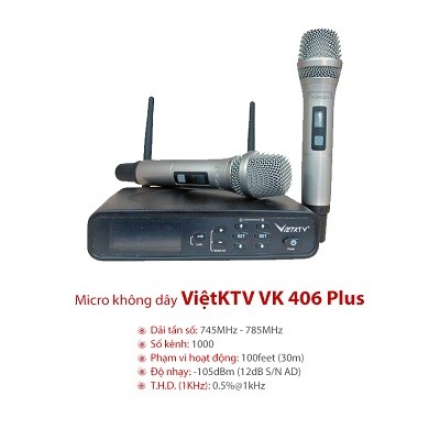 - Tính năng mới mà VietKTV trang bị cho VK406Plus là tự động kiểm soát tín hiệu, gia tăng tín hiệu cả 2 phía, giúp nâng tầm hoạt động của micro lên cao hơn, xa hơn mà vẫn đảm bảo chất lượng tín hiệu.