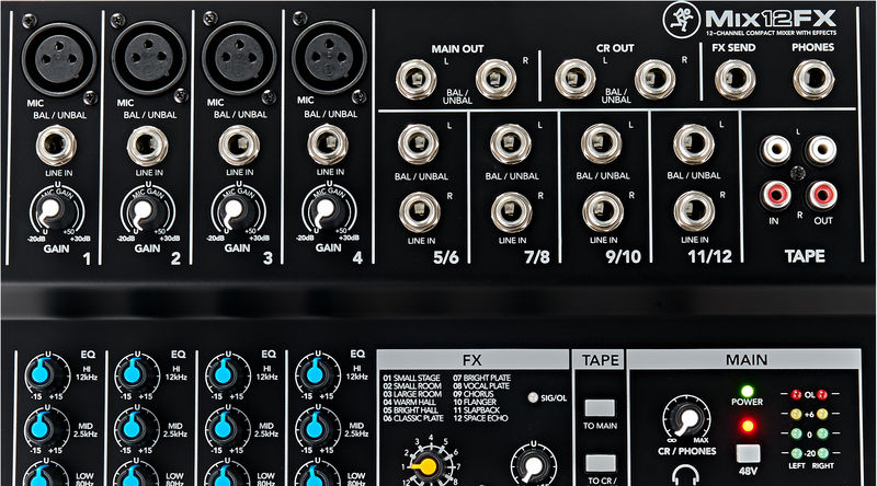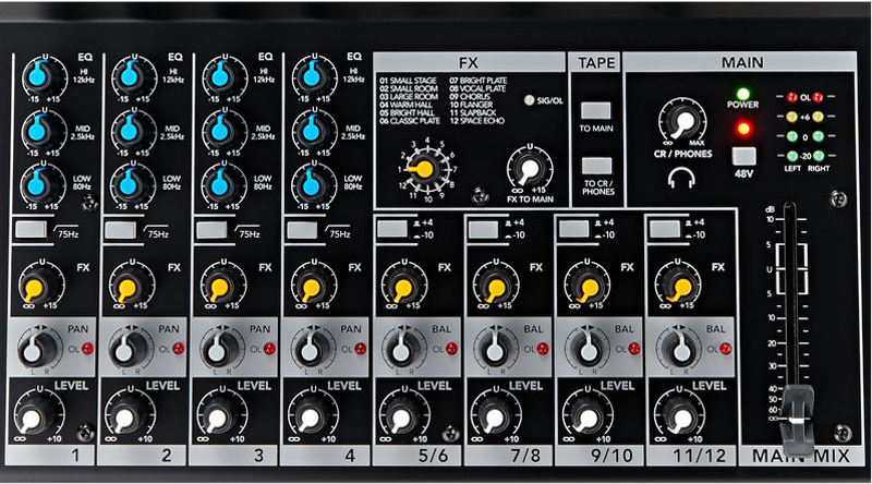 - 4 đầu vào Micrô / Đường truyền với 3 băng tần EQ và nguồn ảo