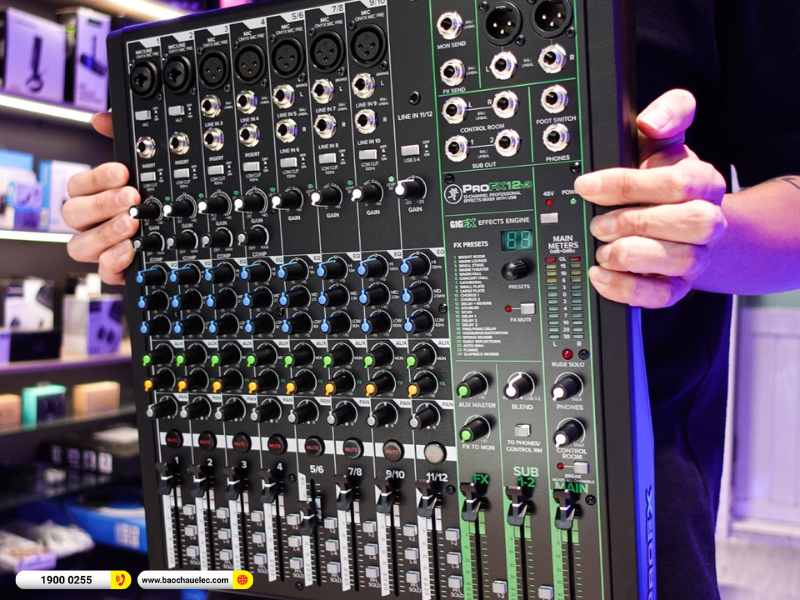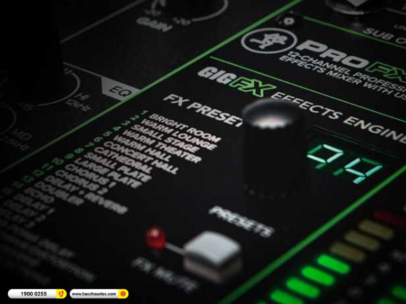Mackie ProFX12v3 tích hợp bộ xử lý GigFX+ với 24 hiệu ứng đa dạng như Reverb, Delay, Chorus, Flanger, Auto-Wah… Mỗi hiệu ứng đều có thể chỉnh sâu các thông số chi tiết như Reverb (Decay, Size, Hi-cut, EQ) hay Delay (Time, Feedback, Hi-cut, EQ). Bộ hiệu ứng này giúp người dùng dễ dàng tạo màu âm linh hoạt, làm giọng hát và nhạc cụ nổi bật hơn, thích hợp cho karaoke, biểu diễn acoustic hoặc livestream.
